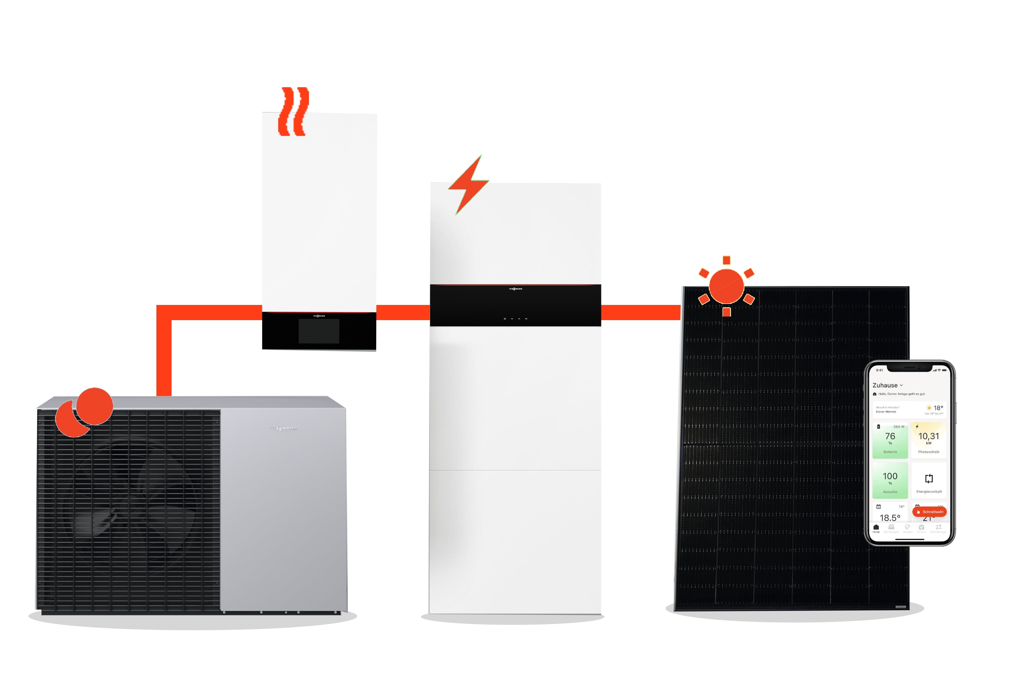 Le tout peut être piloté sur Smartphone grâce à votre l'application ViCare qui affiche en temps réel les flux d'énergie de votre habitation et vous permet de paramétrer le niveau de confort thermique choisi.